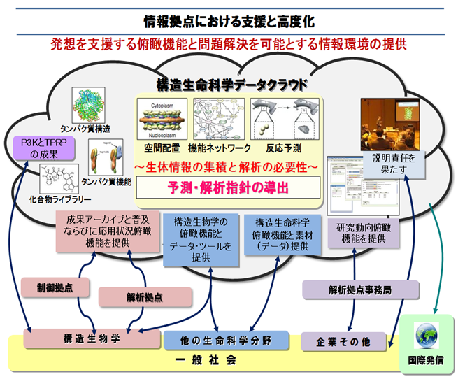 情報拠点」はこの構造生命学データクラウドによって、わが国が今まで投資してきた関連分野のプロジェクトの成果を、構造生物学にとどまらず生命科学全体に浸透させ、関連する企業などの波及効果も考慮して、創薬等に向けた「発想を支援する俯瞰機能」と「問題解決を可能とする情報環境」を提供し、わが国における創薬等を支援する情報基盤の確立を目指します。